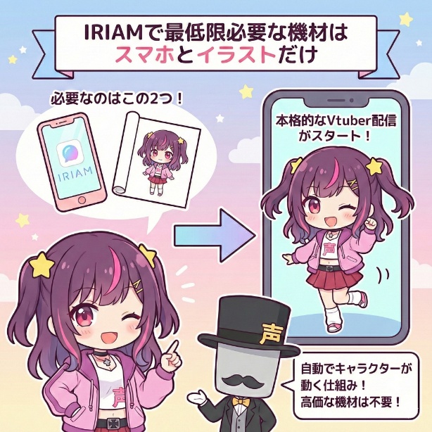 このように、IRIAMでVtuberとしてライバーデビューするために最低限必要な機材は、基本的に「スマホ」と「キャラクターイラスト」の2点だけです。