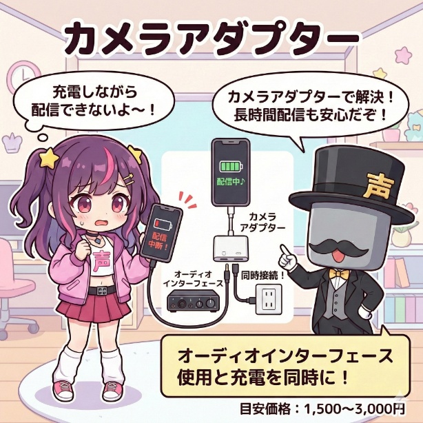 しかし、カメラアダプタを間に接続すれば、オーディオインターフェースと充電ケーブルを同時に挿せるようになり、時間を気にせず配信に集中できるでしょう。