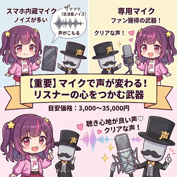配信の音質はリスナーの満足度に直結するため、「聴き心地の良い声」は、あなたのファンになってもらうための強力な武器になります。