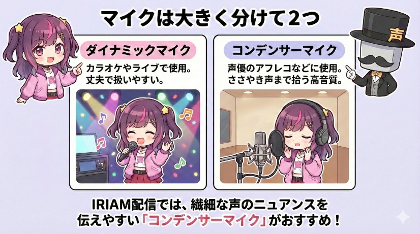 IRIAMでリスナーの心をつかむためには、あなたの声をクリアに届ける「マイク」が非常に重要な機材です。特に「雑談」や「歌枠」をメインに活動したいなら、専用マイクの導入を強く推奨します。