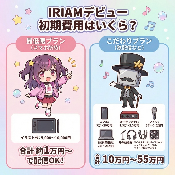 IRIAMで活動する際の初期費用はスマホとイラストを足した金額になりますが、スマホを持っている人がほとんどなので、実際にはイラスト代の1万円でIRIAMで配信が可能です。