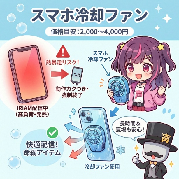 このように、冷却ファンは単にスマホを冷やすだけでなく、大事な配信を「事故」から守るための保険です。