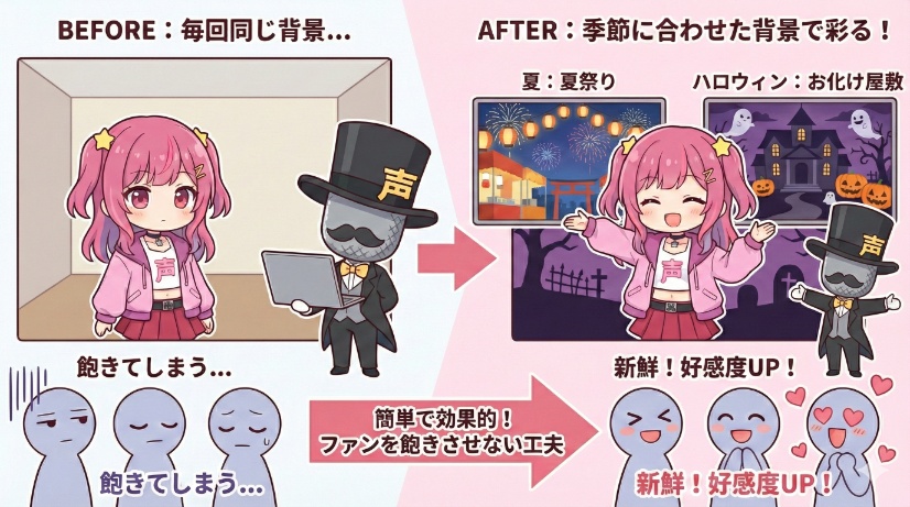 例えば、雑談配信の背景を季節に合わせて変えるだけで、視聴者に「おっ」と思わせることができます。