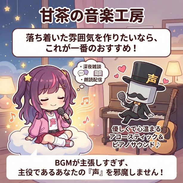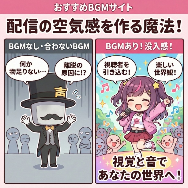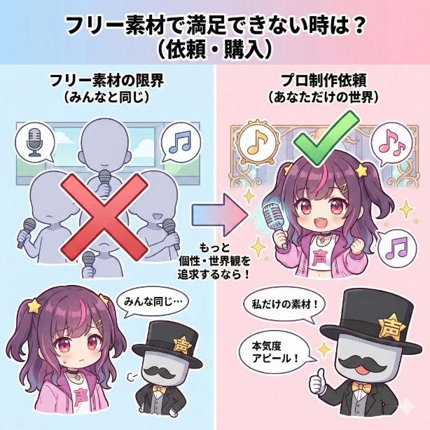 特に、活動が軌道に乗ってくると、自分専用の素材やBGMを持つことが、ファンに対する「本気度」のアピールにも繋がります。