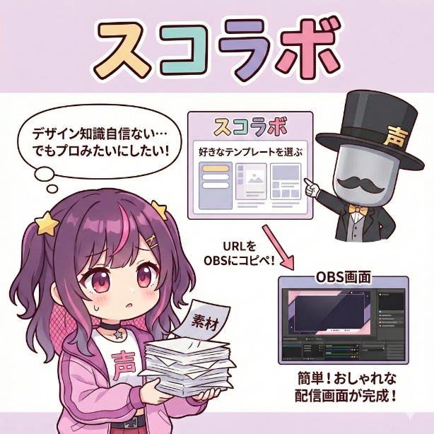 「デザイン知識に自信がない…でもプロみたいな配信画面にしたい!」と悩むあなたには、配信ソフトOBSと直接連携できる「スコラボ」が絶対におすすめです。