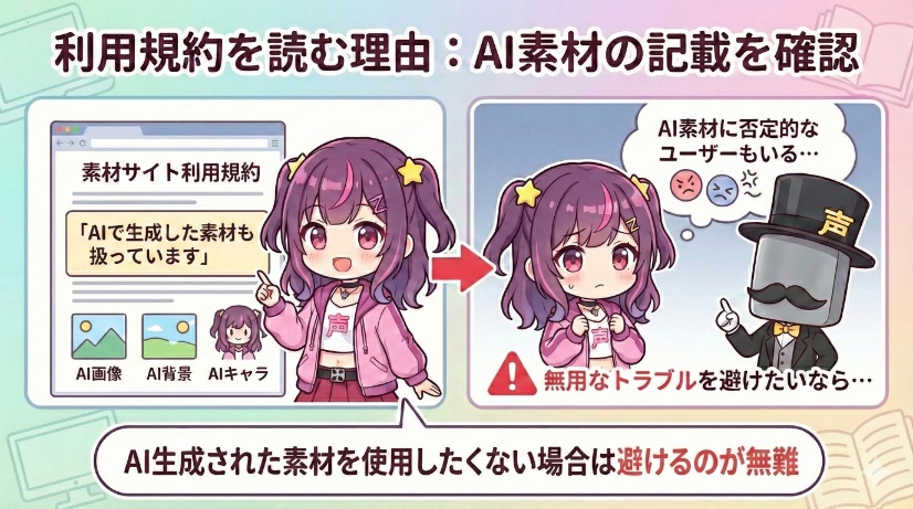 また、利用規約を読む理由としては他にもあります。1つ例を出すとAIで生成されている素材の記載ですね。