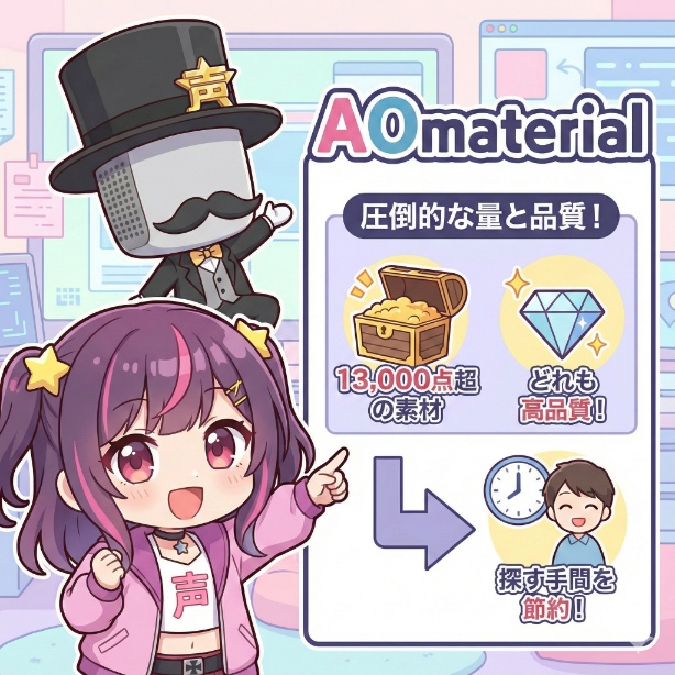VTuber活動で使う素材のクオリティと量の両方を求めるなら、まず最初に「AOmaterial」をチェックすることを強くおすすめします。