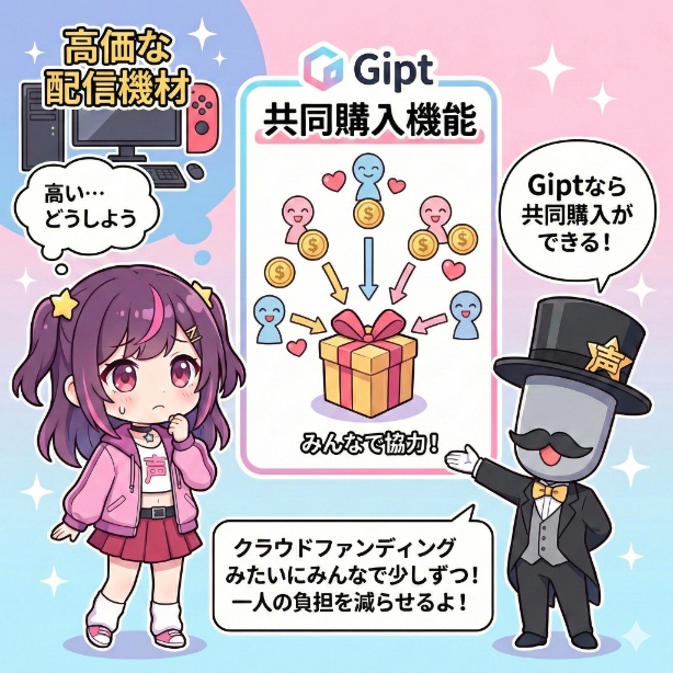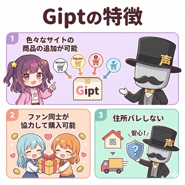 Giptは、住所バレを完全に防ぐ仕組みや、ファン同士で少しずつお金を出し合う「共同購入」機能など、配信者に特化した優しい機能が詰まっています。