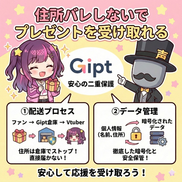 Giptを利用すれば、Vtuber活動で最も避けたいプレゼント受け取り時の「身バレ」を完全に防ぎ、安心してファンからの応援を受け取れます。