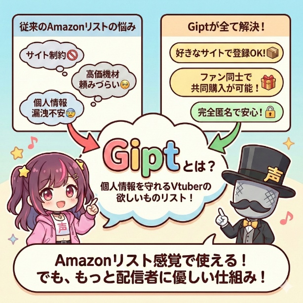 Gipt(ジプト)は、個人情報を完全に守りながら、本当に欲しいものをファンに伝えられる、Vtuberに最適な「欲しいものリスト」作成サービスです。