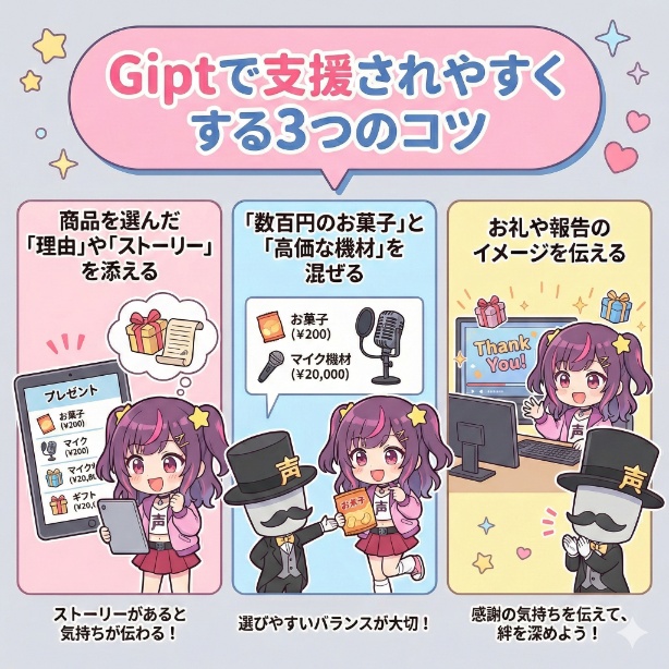 Giptを単なる「物資調達のためのリスト」として使うのではなく、日頃の応援に対する感謝や、これからの活動への熱意を伝える「ファンとのコミュニケーションツール」として捉えてみてください。