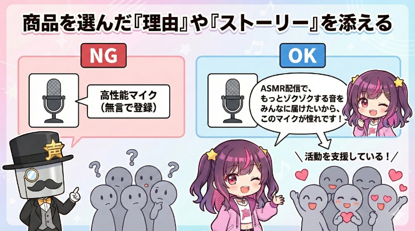 リストを公開する際や配信の中で、「もし届いたら、開封配信で紹介するね!」「新しいマイクで歌枠をやるね!」など、届いた後の未来を共有しておきましょう。