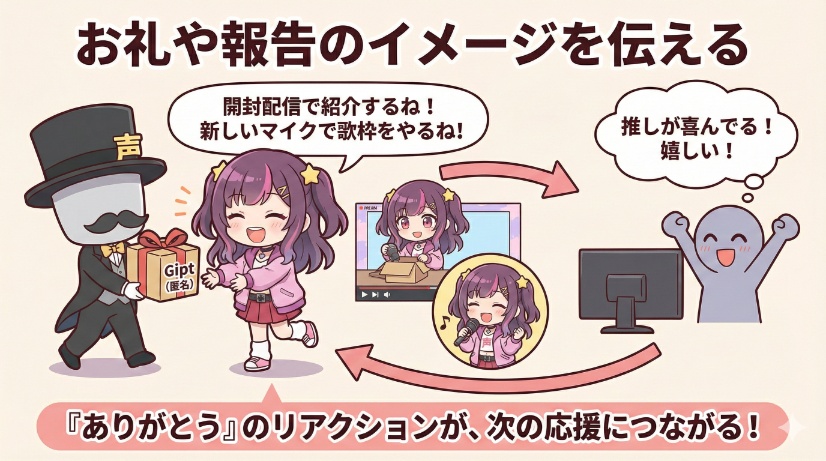 Giptは匿名で送れるからこそ、届いた後の「ありがとう」のリアクションが、次も応援したくなる一番のきっかけになります。