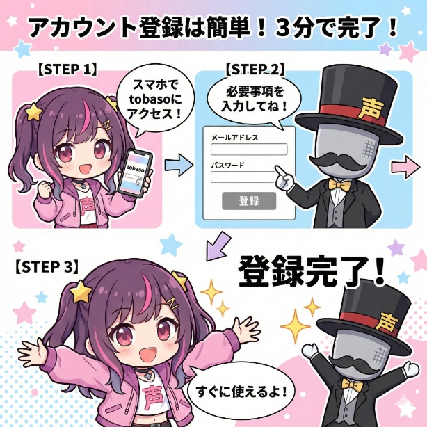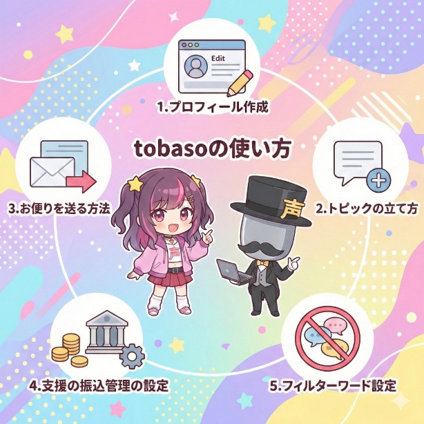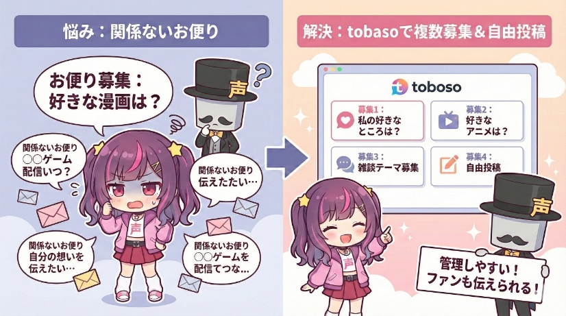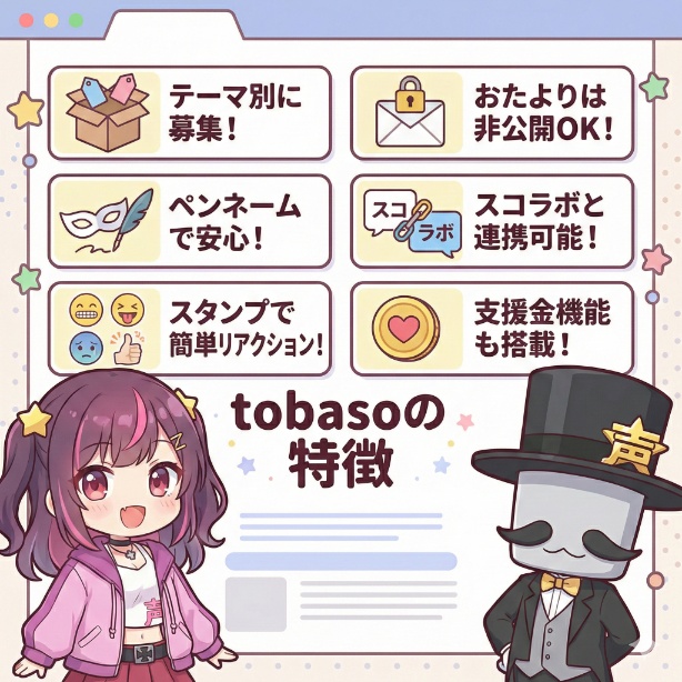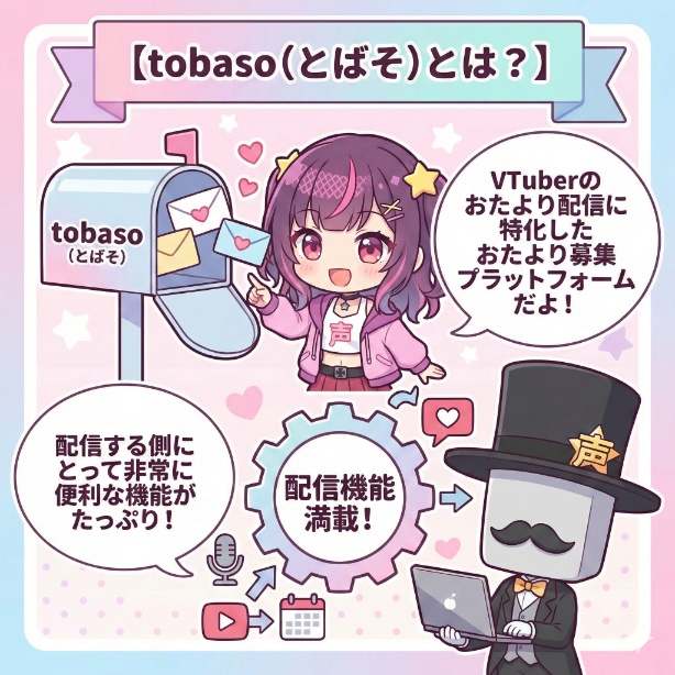 tobaso(とばそ)とは、VTuberのおたより配信に特化したおたより募集プラットフォームです。