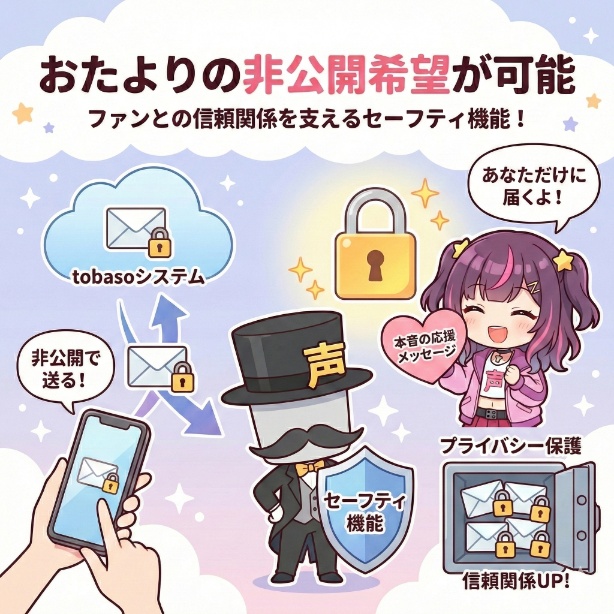 このように、tobasoの非公開希望機能は、デリケートな内容も安心して送れる場を提供し、ファンとの信頼関係を盤石なものにします。