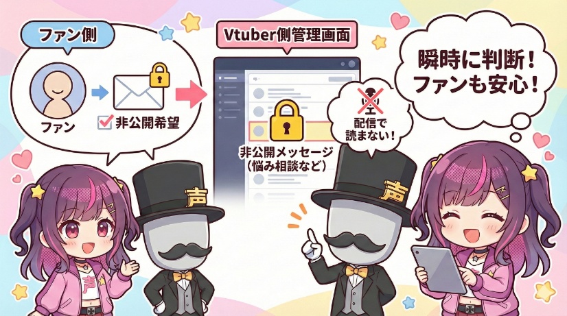 配信で紹介して良いお便りか、自分だけが読むべきお便りかが一目で分かるため、「うっかり公開してしまった」という配信事故を未然に防ぎます。この安心感が、ファンが心を開く土台となります。