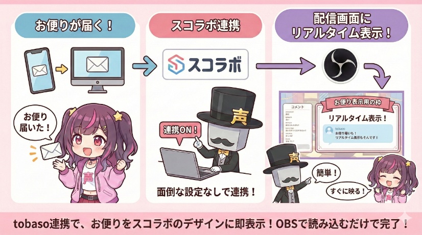 tobasoは、配信画面デザインツール「スコラボ」と連携しており、誰でも手軽に、見栄えの良いお便り紹介配信を実現できます。
