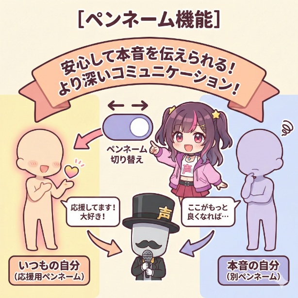 普段は固定のペンネームで応援しつつ、少しデリケートな意見や普段のキャラクターでは恥ずかしい質問をしたい時には別の名前を使えるため、心理的なハードルが大きく下がります。