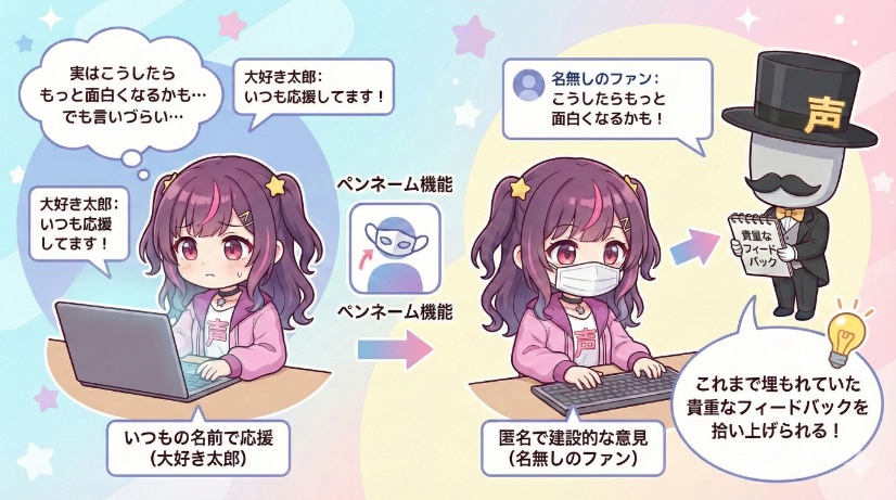 そのファンが、あなたの配信に対して「実はこうしたらもっと面白くなるかも…」という改善案を伝えたい時、いつもの名前では言い出しにくいかもしれません。