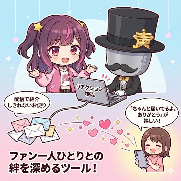 これにより、ファンは自分のメッセージが配信で読まれなくても、「推しはちゃんと目を通してくれたんだ!」と実感でき、寂しい思いをすることがありません。