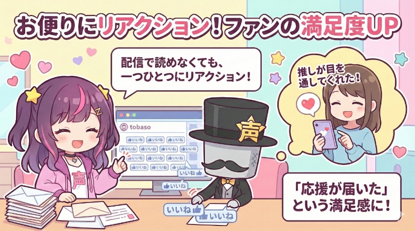 tobasoのリアクション機能は、配信で紹介しきれないお便りにもあなたの感謝を届け、ファン一人ひとりとの絆を深めるための強力なツールです。