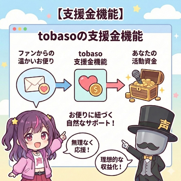 tobasoの支援金機能は、ファンに無理をさせることなく、あなたの活動を自然な形で応援してもらえる、理想的な収益化の仕組みです。