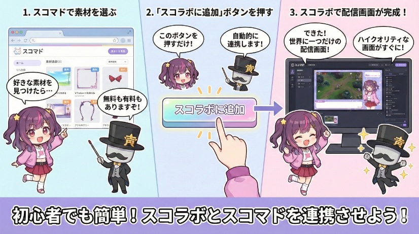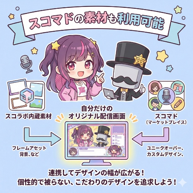 「もっと自分だけのオリジナルな配信画面を作りたい」という方のために、スコラボは連携サービス「スコマド」の素材を取り込んで、デザインの幅をさらに広げられます。