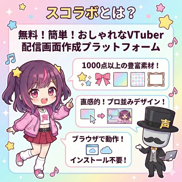 スコラボは、デザインスキルがなくても誰でも簡単におしゃれなVTuber用の配信画面を無料で作成できる、画期的なプラットフォームです。