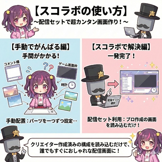 配信セットを利用することで、提供しているクリエイター側で既に画面構成が完了しているので、あとはスコラボで読み込みを行うだけなのでお手軽です。。