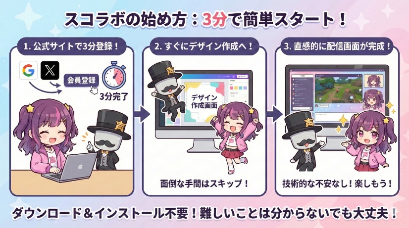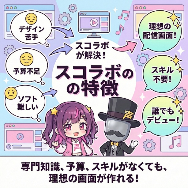 スコラボが多くのVTuber初心者に選ばれてるのには、明確な理由があります。それは、「スキル・予算・専門知識がなくても、理想の配信画面が作れる」という、初心者の悩みに寄り添った特徴が揃っている点です。