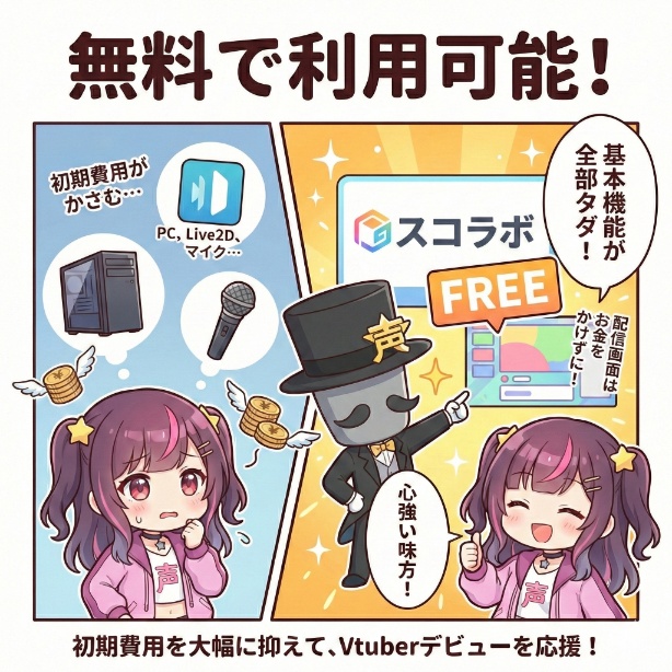 スコラボの最も大きなメリットの一つは、基本機能をすべて無料で利用できる点です。これにより、VTuber活動の初期費用を大幅に抑えることが可能になります。