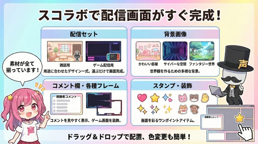 スコラボを使えば、デザイン経験ゼロ・予算ゼロでも、素材を選ぶだけでプロ級の配信画面が無料で作れてしまいます。