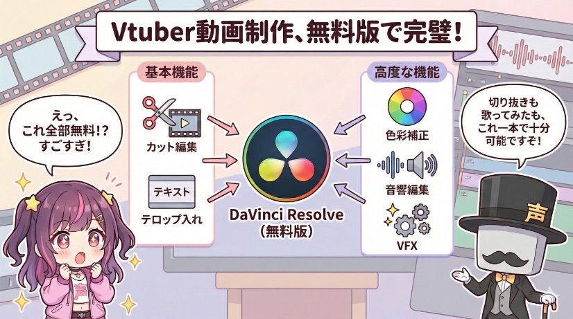このように、コストをかけずに動画のクオリティを徹底的に追求したいVtuberにとって、DaVinci Resolveは最高のおすすめツールと言えます。