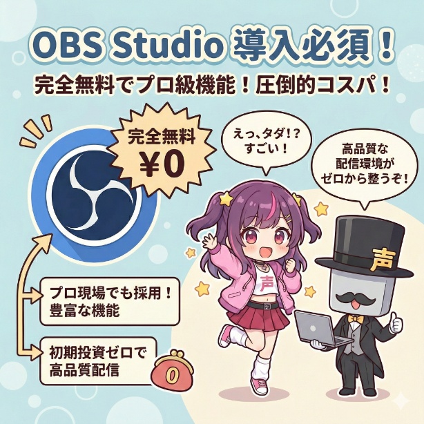 通常、これほどの機能を持つソフトは高価ですが、OBS Studioは初期投資ゼロで高品質な配信環境を整えることを可能にします。