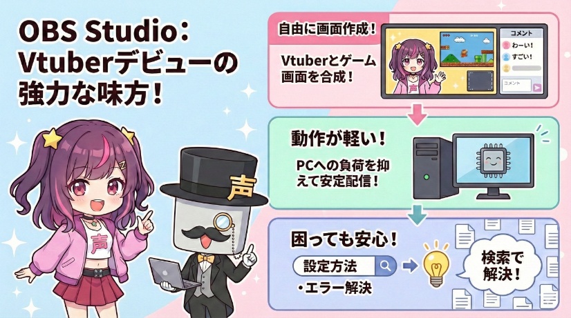 このように、コスト・機能性・情報量の三拍子が揃ったOBS Studioは、全てのVtuberにとって「まず導入すべき」おすすめツールと言っても過言ではありません。