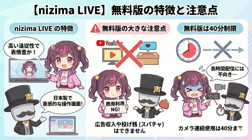無料版は商用利用が許可されておらず、YouTubeの広告収入や投げ銭(スパチャ)機能などを使った収益化ができません。