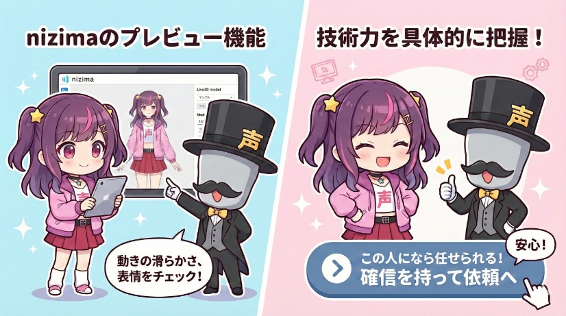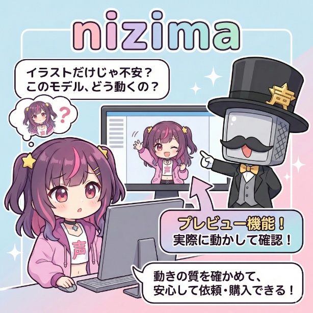 その最大の理由は、nizima独自の「プレビュー機能」にあります。これは、クリエイターが制作したモデルが、実際にPC上でどのように動くのかを購入や依頼の前に直接確認できる画期的な仕組みです。