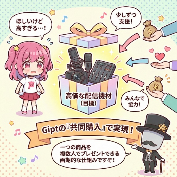 その理由は、Gipt最大の特徴である「共同購入」機能にあります。これは、一般的な「ほしい物リスト」とは異なり、一つの商品を複数のファンが少しずつお金を出し合ってプレゼントできる仕組みです。