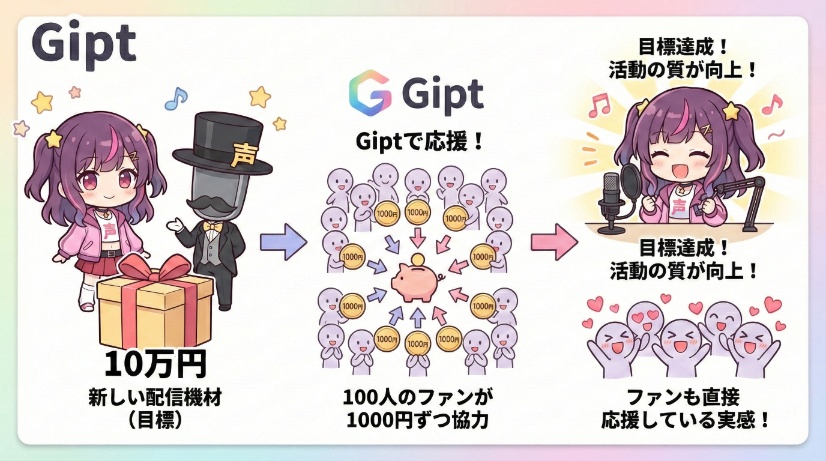 活動の質を上げるための高価な機材を、ファンと協力して手に入れたいなら、ギフトプラットフォーム『Gipt』が画期的な解決策になります。