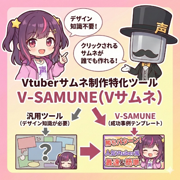 クリックされるVtuber向けサムネイルを、最速かつ簡単に作りたいなら、サムネイル制作特化ツール『V-SAMUNE(Vサムネ)』が最強の選択肢です。