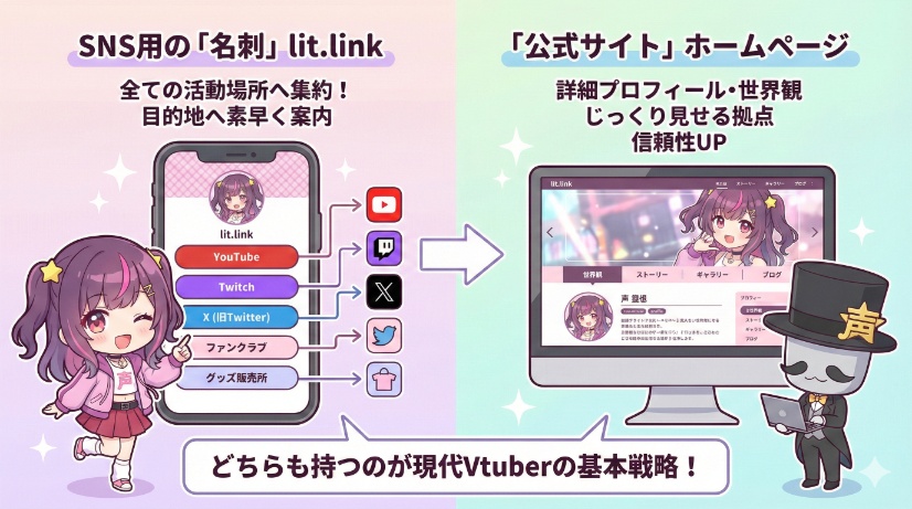 このように、SNSでの「名刺」となるlit.linkと、活動の信頼性を高める「公式サイト」。この2つは、どちらか一方を選ぶのではなく両方を持つのが現代Vtuberの基本戦略です。