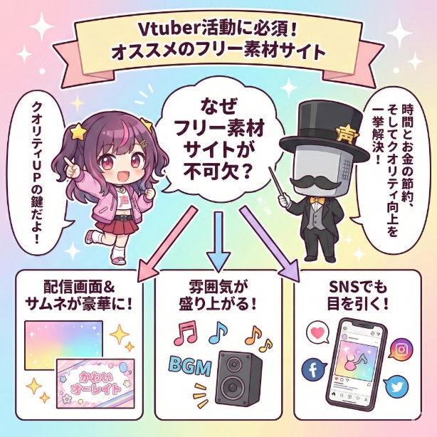 Vtuber活動のクオリティを手軽に、かつ飛躍的に向上させたいなら、無料の「フリー素材サイト」の活用が不可欠です。