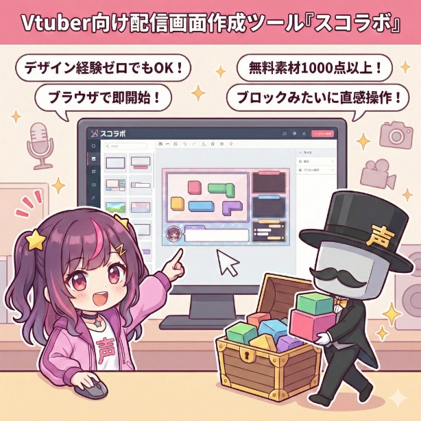 デザイン経験ゼロでも、プロ並みのオシャレな配信画面を自作したいなら、Vtuber向け配信画面作成ツール『スコラボ』が最もおすすめです。