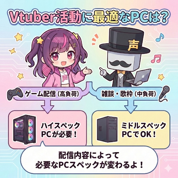 なぜなら、配信する内容によってPCの必要スペックが変わるからですね。