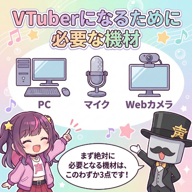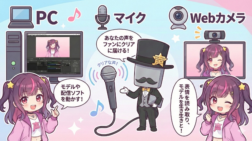 Vtuberとして活動を始めるために、まず絶対に必要となる機材は「PC」「マイク」「Webカメラ」のわずか3点です。