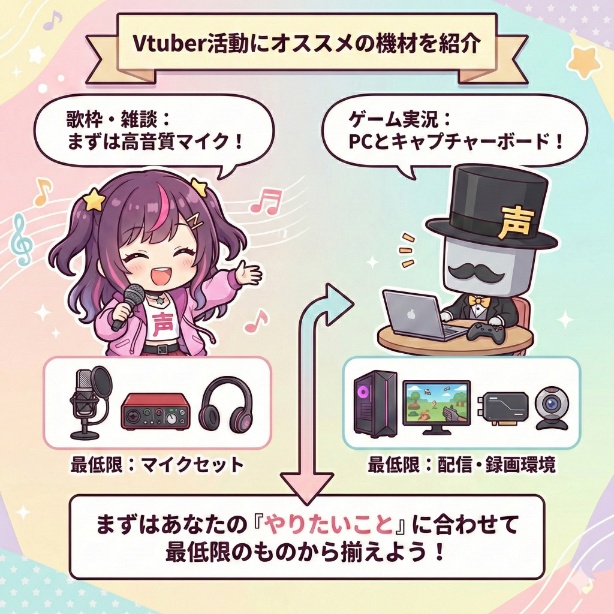 Vtuberになるための機材は、まずあなたの「やりたいこと」に合わせて最低限のものから揃えるのがおすすめです。