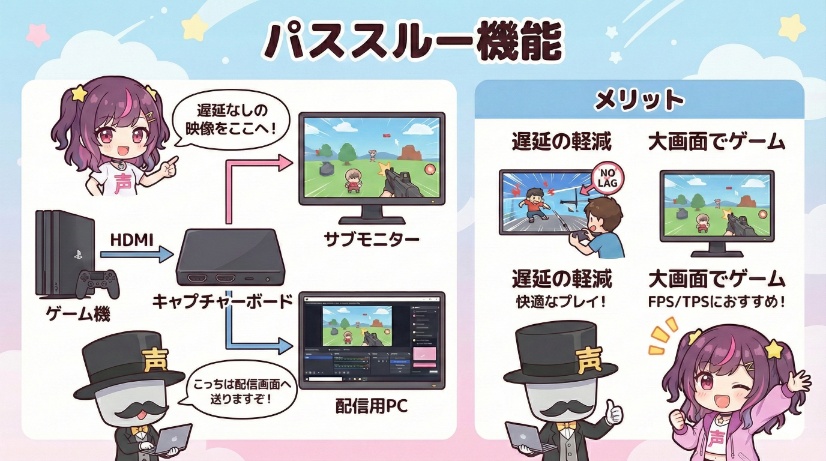 モニターを2台運用する前提にはなりますが、FPSやTPS系のゲームなどは遅延は命取りになるのでキャプチャーボードを選ぶ際は「パススルー機能」付きを選ぶのをオススメします。