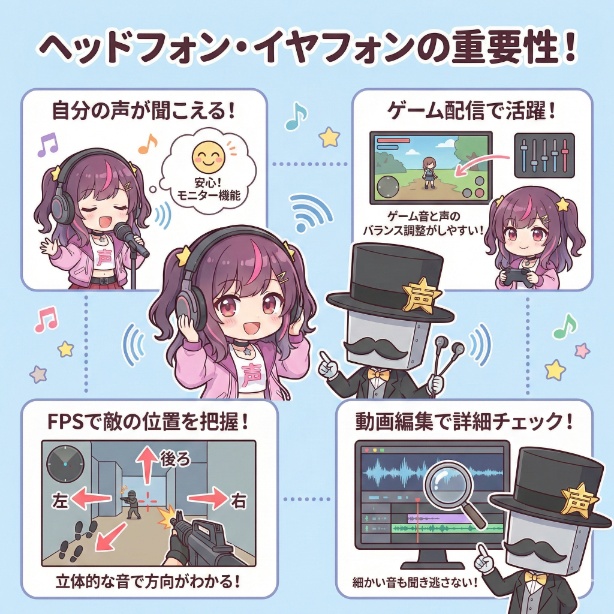 他にも、ライブ配信だけではなく動画編集をするときも、ヘッドフォンやイヤホンがあるとスピーカーより詳細に音のチェックが出来るのでオススメです。