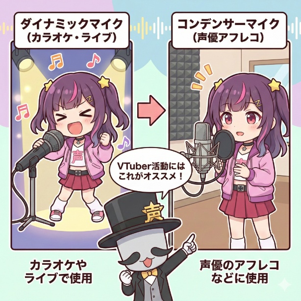 - ダイナミックマイク:カラオケやライブで使用