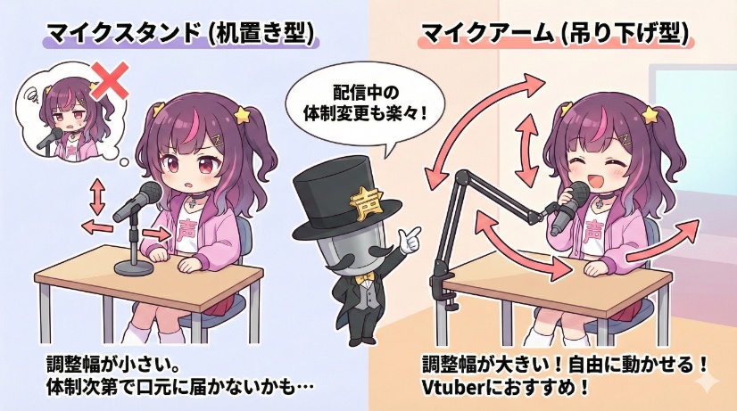 今回は①②どちらのタイプのマイクも紹介していきますので、自身の配信スタイルや金銭状況を考慮して選んでみてください。